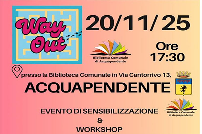 Giovedì 20 novembre, Comune di Acquapendente e Biblioteca celebrano la Giornata internazionale per l’eliminazione della violenza contro le donne nella sede di via Cantorrivo, 13 con l’evento di sensibilizzazione intitolato “Way out”. Sarà presente anche l’avvocata Cipriana Contu, esperta in tutela dei diritti umani e violenza di genere.