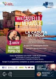 Un altro appuntamento con il grande teatro d’autore quello di martedì 3 agosto alle ore 21.00  nel suggestivo spazio affacciato sul mare nell’ambito della rassegna estiva “Vivi il Castello delle Meraviglie”, promossa dalla Regione Lazio  e organizzata dalla società regionale LAZIOcrea in collaborazione con il Comune di Santa Marinella.  La caduta di Troia, una produzione Compagnia Orsini liberamente tratta dal Libro II dell’Eneide con la regia Massimo Popolizio e musiche eseguite dal vivo da Stefano Saletti, Barbara Eremo e Pejman Tadayon.