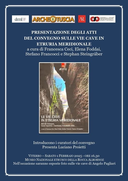 prevista la presentazione degli atti del convegno internazionale “Le vie cave in Etruria meridionale” svoltosi il 7 e l’8 ottobre del 2022, fra Castel Sant’Elia e Corchiano, in cui intervennero i responsabili della tutela della nostra Soprintendenza.