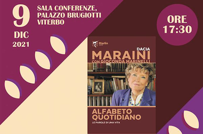 Giovedì 9 dicembre, alle 17.30, nella Sala Conferenze del Palazzo Brugiotti di Viterbo, in un incontro moderato da Lorena Paris, a cura di Archeoares, Dacia Maraini si racconta per la prima volta in un ritratto intimo, personale, inedito.