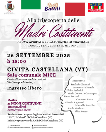 Venerdì 26 settembre alle ore 18.00, presso la Sala Mice del centro commerciale Marcantoni di Civita Castellana, si terrà la prova aperta del laboratorio teatrale sulle Madri Costituenti, a cura dell’attrice e regista Sylvia Milton, e dell’associazione Battiti della Casa delle Donne di Vetralla. L’iniziativa è promossa dall’Anpi di Civita Castellana.