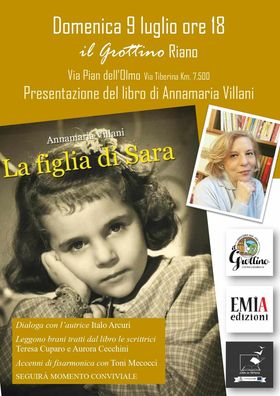 Domenica 9 luglio, a Riano (Rm), alle ore 18, presso la terrazza esterna de “Il Grottino”, in Via Pian dell’Olmo, Via Tiberina Km 7.500, sarà presentato il nuovo romanzo di Annamaria Villani, dal titolo “La figlia di Sara”, edito da Emia Edizioni.