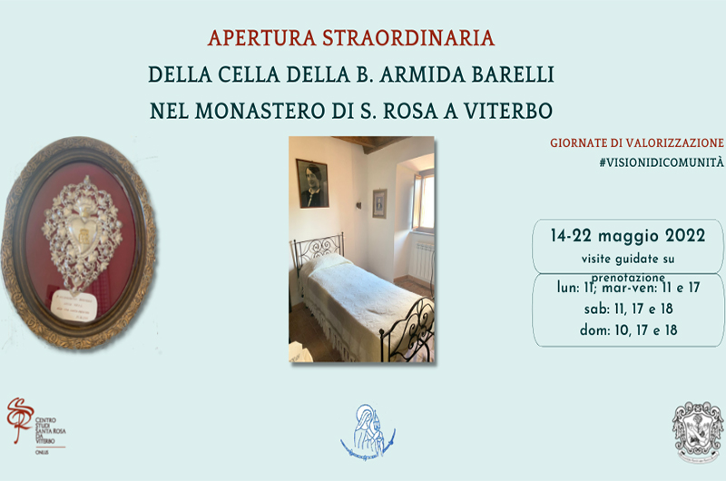 In occasione delle Giornate di valorizzazione del patrimonio ecclesiastico (#testimonidicomunita – edizione 2022), dal 14 al 22 maggio sarà possibile visitare la cella della beata Armida Barelli presso il Monastero di S. Rosa da Viterbo, preservata dalle monache nella sua forma originaria.