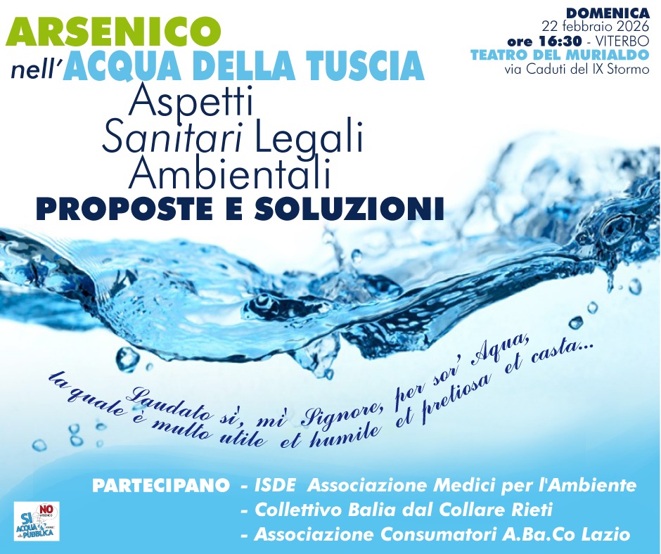 Domenica 22 febbraio, alle ore 16.30, il Teatro della parrocchia di San Leonardo Murialdo, in via Caduti IX Stormo, a Viterbo, ospita il convegno “Arsenico nell’acqua: aspetti sanitari, legali e ambientali”.