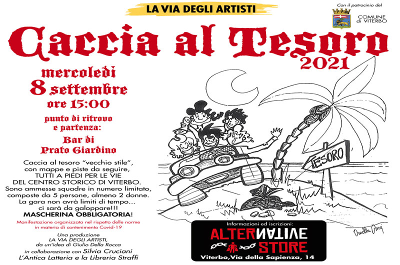 In collaborazione con la dottoressa Silvia Cruciani e l’Assessorato alla Cultura, con il patrocinio del Comune di Viterbo, l’associazione la Via degli Artisti ha organizzato una CACCIA AL TESORO riservata ai minori di 19 anni per le vie del centro di Viterbo. Molti i partners del centro storico: Euroform SAS, Nonno Ugo, l’Alternative Store, la Libreria Straffi, l’Antica Latteria, Viterbo Mia, Bizzarri, il bar di Prato Giardino.