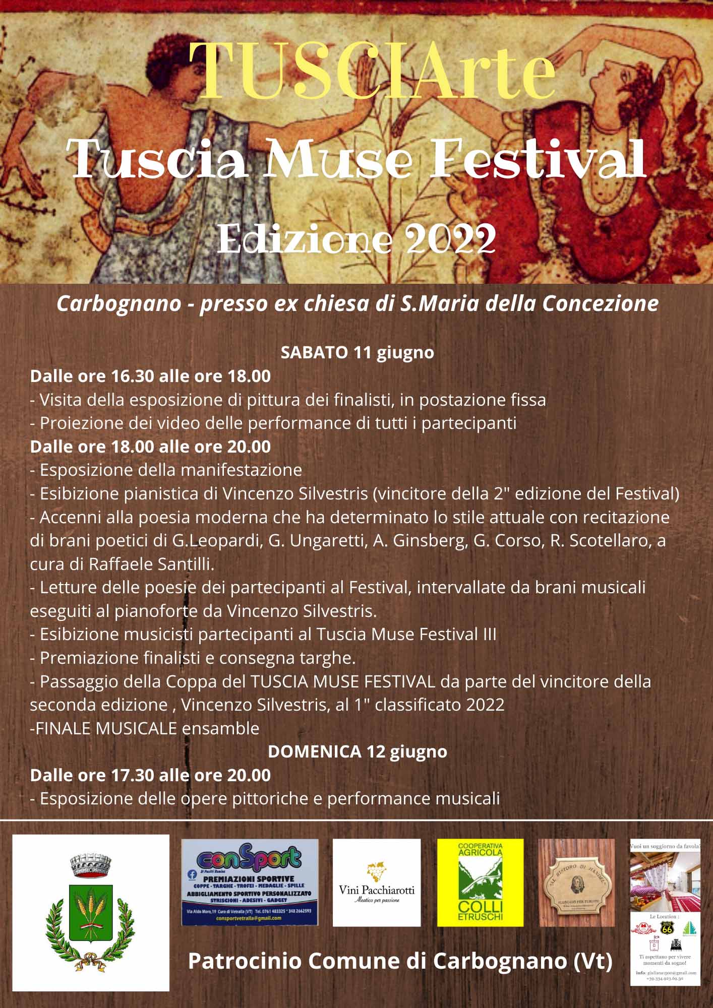 Sabato 11 giugno, presso la ex chiesa di Santa Maria della Concezione, a Carbognano, si terrà il primo appuntamento di TUSCIArte. Questo evento è la conclusione del Tuscia Muse Festival, giunto alla sua terza edizione; è un festival online gratuito che dà la possibilità a chiunque lo desideri di mettersi “in vetrina”, essere pubblicizzati e votati online, per poi essere premiati durante la serata finale con soggiorni o prodotti tipici della Tuscia.