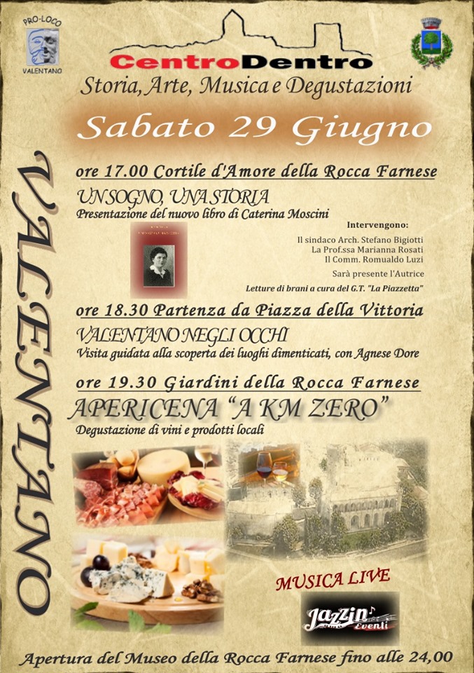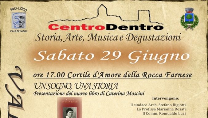 Si inizia alle 17.00 presso il Cortile d’Amore della Rocca Farnese, con la presentazione del nuovo libro dal titolo “Un Sogno, Una Vita” della scrittrice autoctona Caterina Moscini, presieduto dalla stessa autrice con gli interventi del Sindaco Arch. Stefano Bigiotti, della Prof.ssa Rosati Marianna e del Comm. Romualdo Luzi.
