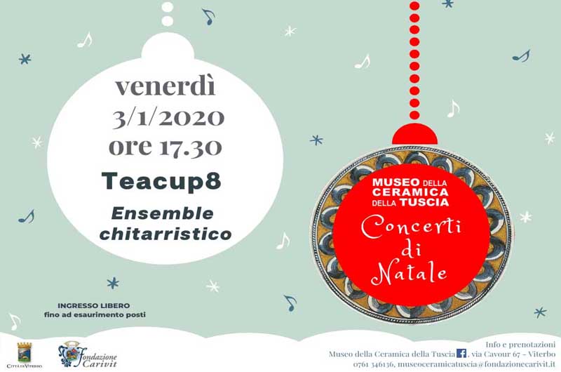 Questi gli appuntamenti di venerdì 3 gennaio 2020 proposti dalla Fondazione Carivit: la mattina, alle ore 11.00, la consueta visita gratuita a Palazzo Brugiotti e alla Quadreria della Fondazione Carivit; il pomeriggio, alle ore 17.30, concerto dei “Teacup8” al Museo della Ceramica della Tuscia.
