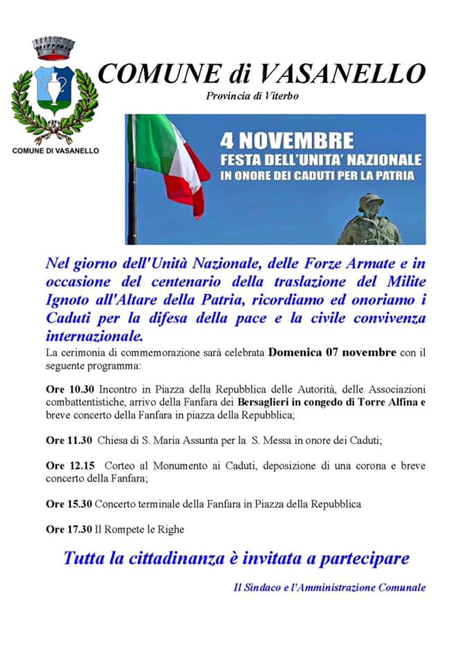 Domenica 7 novembre, a Vasanello, si celebra la Festa dell’Unità Nazionale e delle Forze Armate.