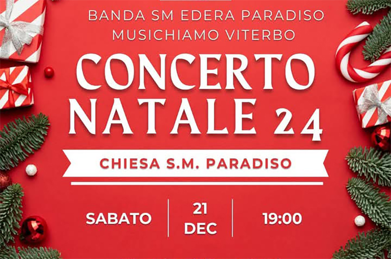 Sabato 21 Dicembre alle ore 19.00 presso la chiesa del Paradiso a Viterbo la banda MusichiAmo eseguira il Concerto di Natale alle ore 19.00.Verranno eseguite musiche di Benedetti, Verdi,Sostakovic. Dè Liguori, in un repertorio che include anche altri autori. Ingresso libero.