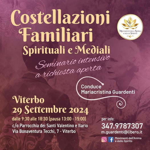 Domenica 29 settembre, a Viterbo, presso la parrocchia dei Santi Valentino e Ilario, è programmato il seminario intensivo condotto da Mariacristina Guardenti sulle Costellazioni Familiari, per vivere e mettere a confronto le esperienze di ognuno attraverso meditazioni spirituali e mediali.