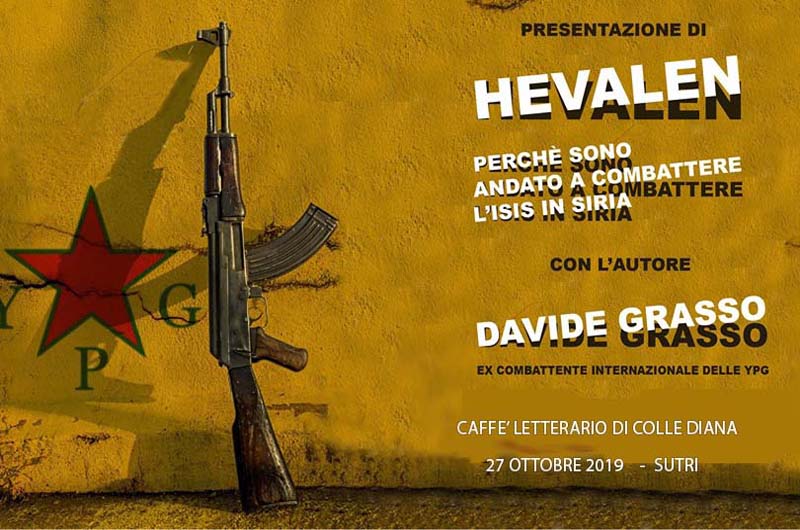 Davide Grasso sarà ospite al Caffè letterario di Colle Diana (Sutri), domenica 27 ottobre – ore 17.30 – per presentare il suo libro “Hevalen – perché sono andato a combattere l’Isis in Siria” (edizioni Alegre) e raccontare la sua esperienza: 7 mesi in territorio siriano nel 2016, altri 2 mesi l’anno dopo, accanto ai miliziani curdi impegnati nella lotta senza quartiere contro i seguaci di al Baghdadi.