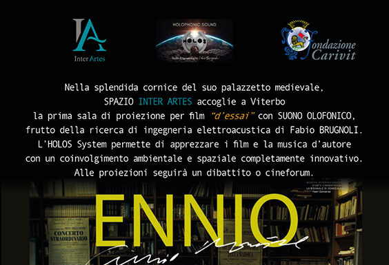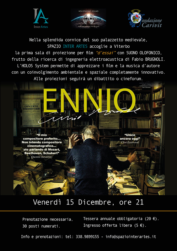 Nella splendida cornice del suo palazzetto medievale, Spazio Inter Artes, a Viterbo, in via della Volta Buoia n° 36, con suono olofonico, frutto della ricerca di ingegneria elettroacustica di Fabio Brugnoli con proiezione di Ennio. Holos System permette di apprezzare i film e la musica d’autore con un coinvolgimento ambientale e spaziale completamente innovativo. Alle proiezioni seguirà un dibattito o cineforum. Venerdi 15 dicembre alle ore 21.00.