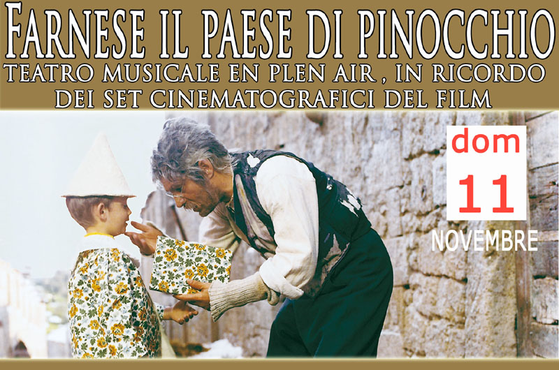 Nel 1971 Il regista Luigi Comencini sceglieva Farnese per girare  la famosa serie televisiva “Le avventure di Pinocchio”. La compagnia teatrale “Giorgio Zerbini” di Montefiascone, insieme ai “MistiCanti Popolari” ci condurranno nel magico mondo di Carlo Lorenzini detto Collodi, attraverso una rappresentazione itinerante nei luoghi dei set cinematografici