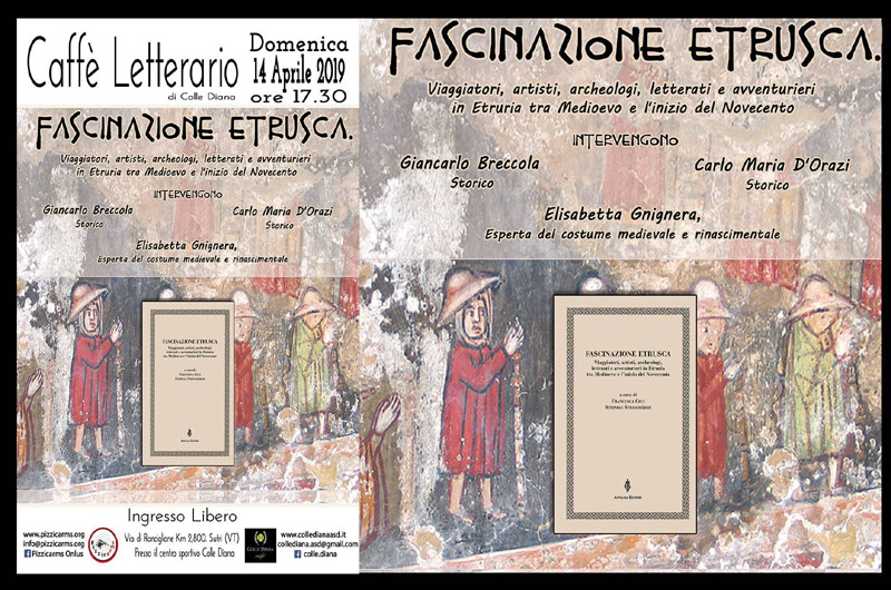 “Con questo incontro dicono gli organizzatori- torniamo ai libri e lo facciamo con un importante contributo alla conoscenza dell’Etruria con Fascinazione Etrusca di Annulli Editori”. Il libro raccoglie gli atti dell’omonimo convegno svoltosi tra Capranica e Vetralla il 26 e 27 maggio del 2017, dedicato ai viaggiatori, agli studiosi e agli amanti dell’Etruria. Ventidue relazioni per ventuno autori, i quali hanno studiato e raccontato l’Etruria dal punto di vista di chi l’ha attraversata nel corso dei secoli, toccando gli argomenti e le materie più varie quali l’archeologia e l’etruscologia, la storia dell’arte, i costumi e le tradizioni popolari, l’architettura, i viaggi a piedi, etc. all’incontro parteciperanno: