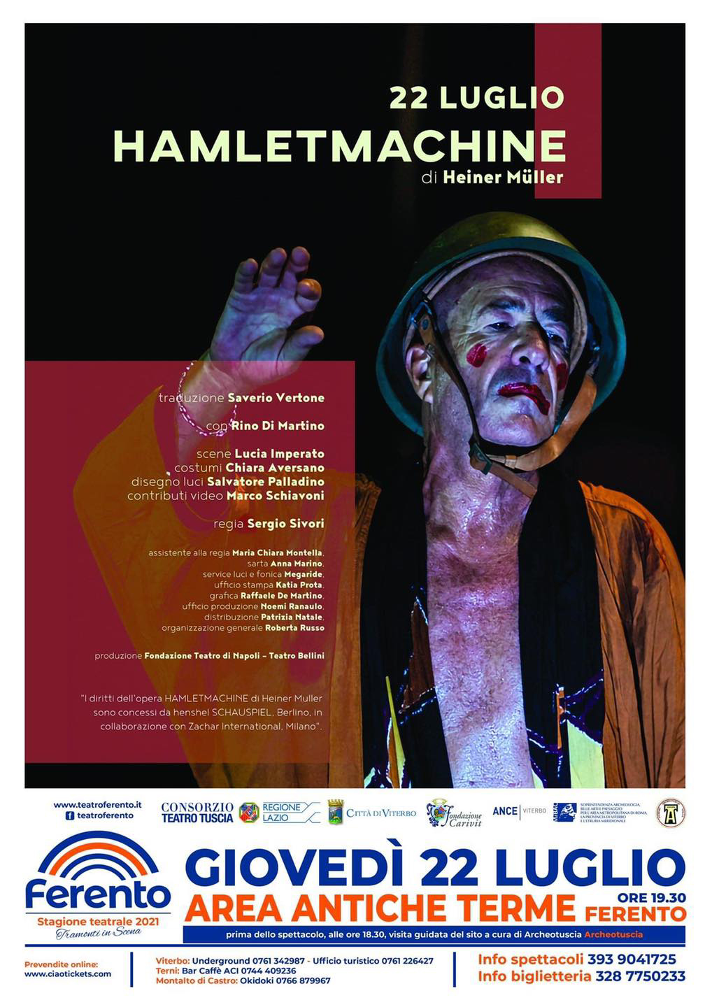 Rino Di Martino interpreta “Hamletmachine” di Heiner Müller con ideazione e regia Sergio Sivori giovedì 22 luglio (ore 19,30), in prima nazionale nell’area antiche terme per la 56esima stagione estiva di Ferento – “Tramonti in scena”, organizzata da Consorzio Teatro Tuscia con il sostegno del Comune di Viterbo, della Fondazione Carivit e dell’Ance di Viterbo e con la direzione artistica di Patrizia Natale.