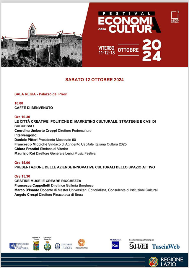 Prosegue fino a domenica 13 ottobre, a Viterbo, la prima edizione del “Festival Economia della Cultura”, evento che promuove il ruolo centrale della produzione culturale e creativa come volano di crescita economica e sociale dei territori.