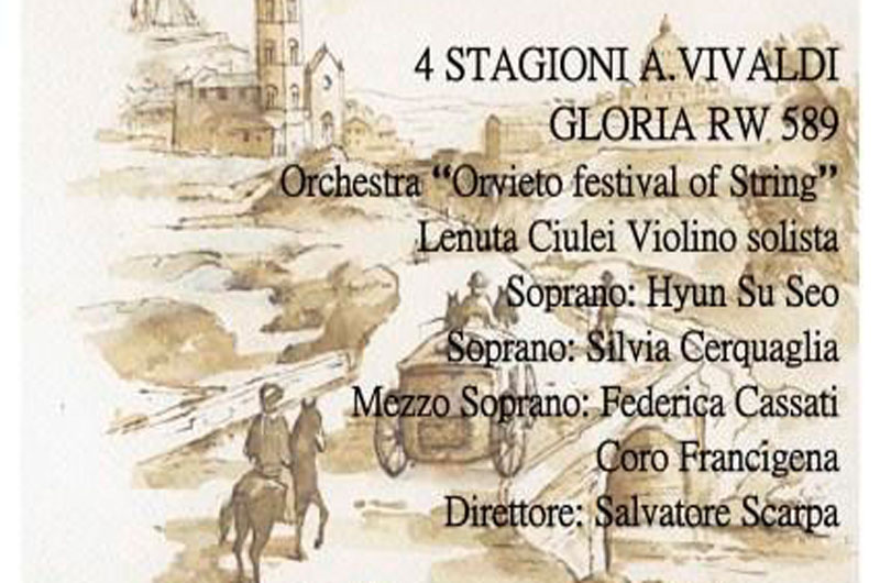 Parallelamente al viaggio nelle Cripte lungo la Via Francigena, il “Francigena musica” propone la rassegna di concerti “Viva Vivaldi” che vedrà il 6 agosto alle 21.15 in san Lorenzo Nuovo chiesa Santa Maria Assunta, coinvolto il Coro Francigena composto dalla collaborazione della Corale Policonica della Parrocchia del Santo sepolcro di Acquapendente, del coro Maria Santa Rosiello di San Lorenzo Nuovo e delle corale Vestri di Santa Fiora in collaborazione con l’Orvieto Festiva of String orchestra promossa da George Athanasiu che vede docenti e studenti di tutto il mondo radunarsi per un master di alta fomazione. Il Programma prevede: