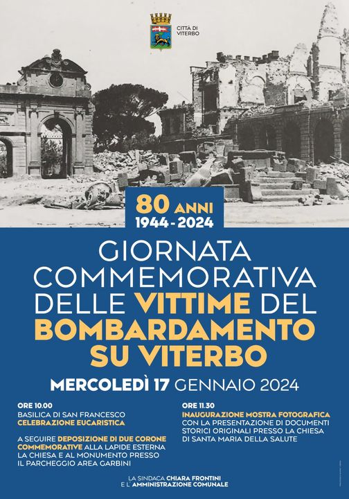 Mercoledì 17 gennaio la giornata commemorativa delle vittime dei bombardamenti su Viterbo. In programma una serie di iniziative per ricordare quanto accaduto quel 17 gennaio del 1944. Alle 10.00 è prevista la celebrazione religiosa alla basilica di San Francesco. Seguirà la deposizione di due corone commemorative, una alla lapide collocata fuori la chiesa e l’altra a piazzale Gramsci, al monumento a ridosso dell’ingresso dell’area Garbini. Alle 11.30, alla chiesa di Santa Maria della Salute, verrà inaugurata la mostra fotografica con immagini e documenti storici, a cura di Rosanna De Marchi e Archeotuscia. “Quest’anno ricorrono 80 anni da quel devastante e tragico bombardamento – sottolinea la sindaca Chiara Frontini -. Era il 17 gennaio 1944. Una data impressa nella memoria dei viterbesi, soprattutto in quella di chi ha vissuto sulla propria pelle una simile tragedia o di chi ha perso un familiare sotto le macerie di quelle bombe. Abbiamo il dovere di ricordare. Di ricordare e raccontare alle giovani generazioni quello che hanno vissuto i loro nonni e quello che è accaduto nella nostra città”.