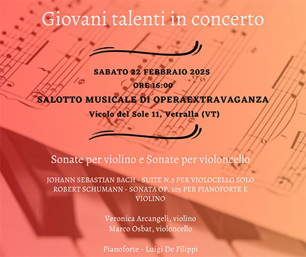 Sabato 22 febbraio, alle ore 16.00, il salotto musicale di OperaExtravaganza, in vicolo del Sole n° 11, a Vetralla, ospiterà “Giovani Talenti in Concerto” con le esibizioni di Veronica Arcangeli al violino e Marco Osbat al violoncello, accompagnati al pianoforte da Luigi De Filippi.