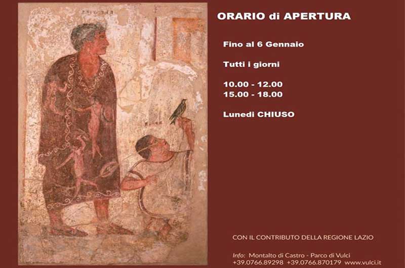 La mostra “Gli ultimi re di Vulci”, allestita nel museo della Ricerca Archeologica di Vulci nel complesso di San Francesco a Canino, fino al 6 gennaio si potrà visitare tutti i giorni, tranne il lunedì, dalle 10.00 alle 12.00 e dalle 15.00 alle 18.00.