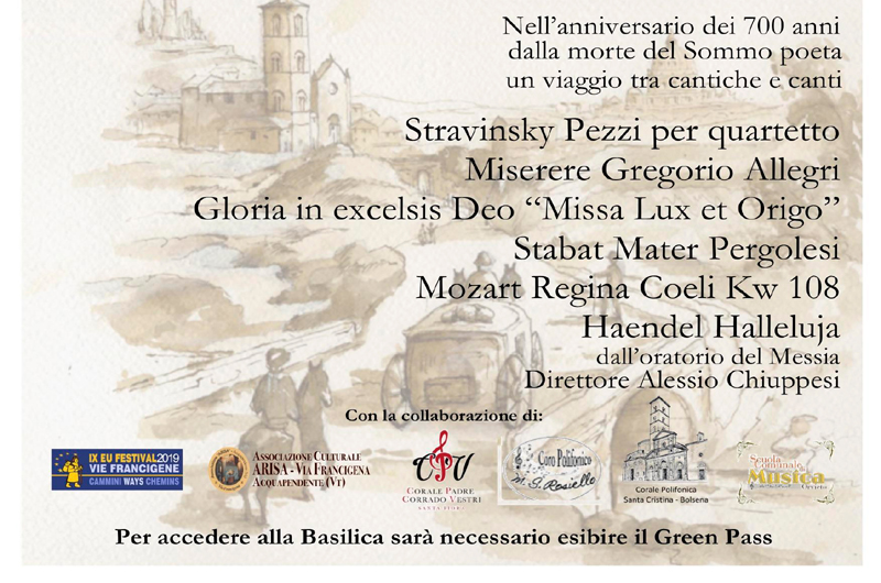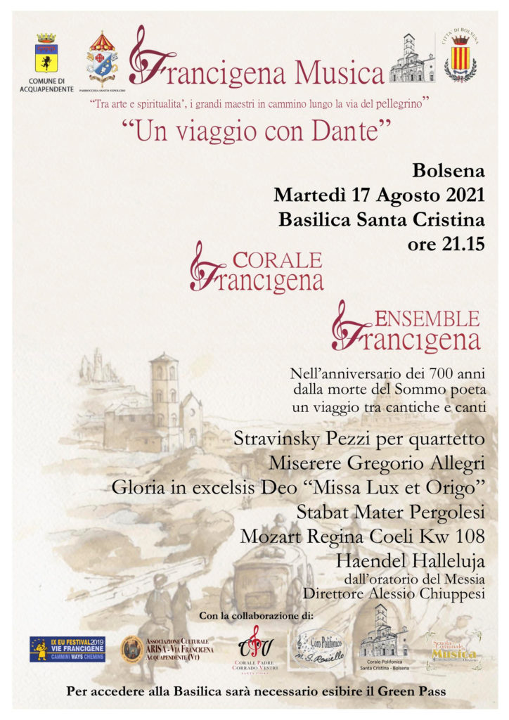 Martedì 17 agosto alle 21.15, oramai giunto al suo quarto appuntamento, il Francigena Musica 2021 In Viaggio con Dante fa tappa a Bolsena, le cui anguille sono citate nelle cantiche della Divina Commedia. Nella cornice della Basilica di Santa Cristina sarà viaggio musicale dall’inferno al paradiso guidati dalla professoressa Luciana Vergaro, l’Ensemble e Corale francigena saprà accompagnarci in questo viaggio. Promosso dall’amministrazione comunale di Bolsena, con la collaborazione dell’ ass. Arisa Via Francigena Acquapendente, l’accesso alla Basilica di Santa Cristina è libero, vincolato alla disponibilità dei posti l’ingresso ed è riservato a chi è provvisto di Green Pass.