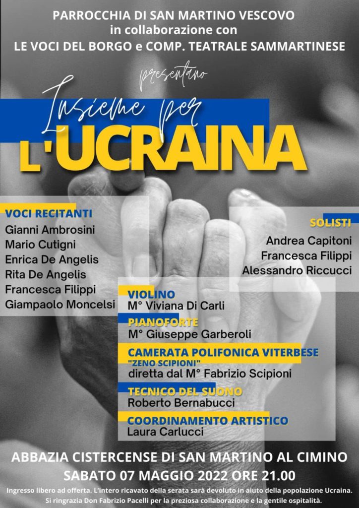 La parrocchia di San Martino Vescovo, in collaborazione con Le voci del borgo e la Compagnia Teatrale Sammartinese, presenta Insieme per l’Ucraina, un concerto programmato per sabato 7 maggio alle ore 21.00 nell’Abbazia Cistercense di San Martino al Cimino.