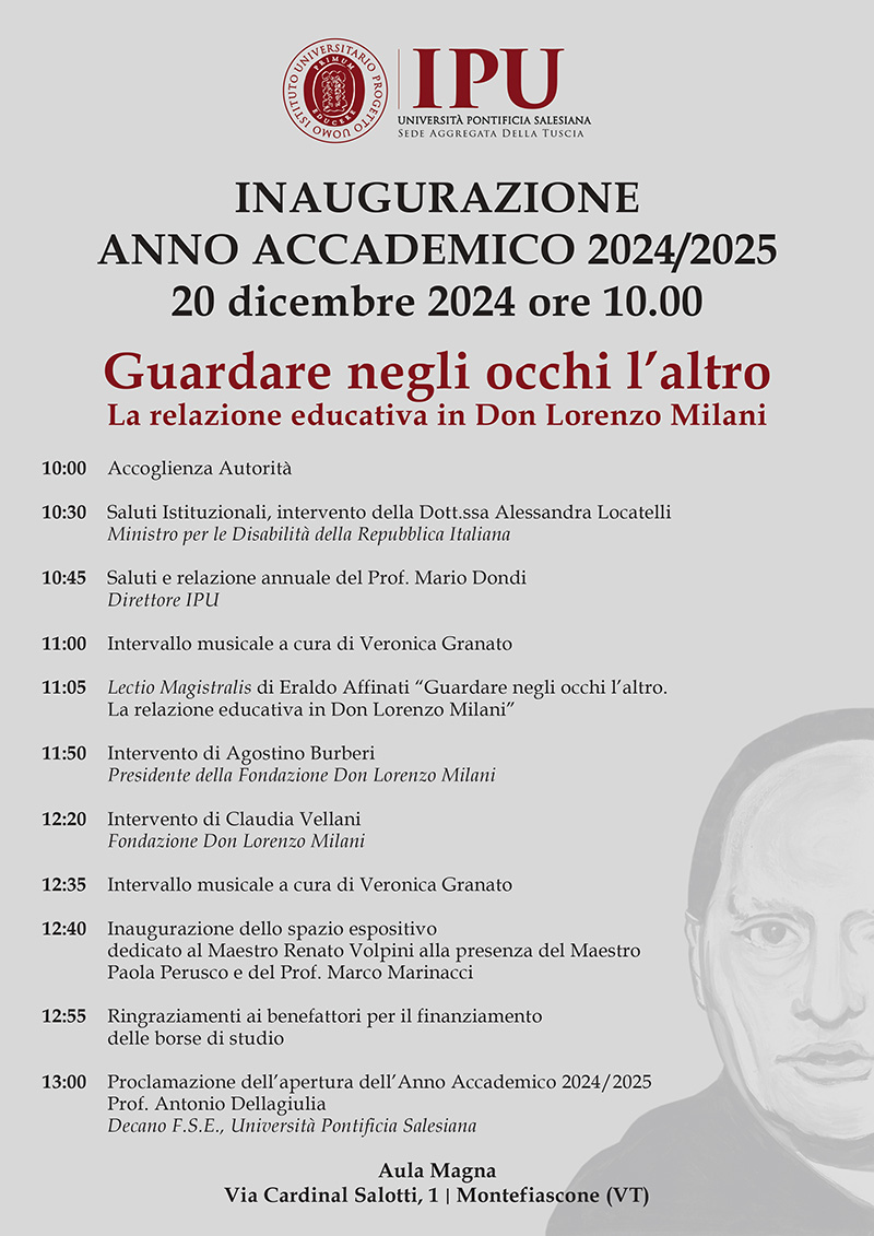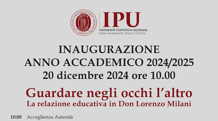 Venerdi 20 dicembre alle ore 10  presso l’ Aula Magna Larissa Viotti  dell’Istituto Progetto Uomo-Università Pontificia Salesiana-Sede Aggregata della Tuscia a Montefiascone,si svolge la Inaugurazione dell’Anno Accademico 2024-2025.