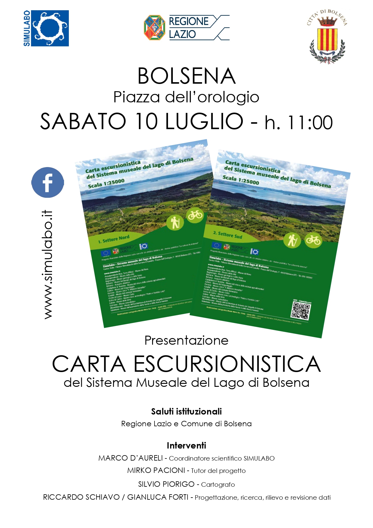 Preceduti dai saluti istituzionali dei rappresentanti della Regione Lazio e del Comune di Bolsena prenderanno la parola, Silvio Piorigo (cartografo) e Riccardo Schiavo (progettazione, ricerca, rilievo e revisione dati). Al loro fianco, in rappresentanza del Sistema museale, Marco D’Aureli (coordinatore Simulabo ), Mirko Pacioni (direttore del Museo Naturalistico Lubriano ) e Gianluca Forti (direttore del Museo del fiore di Torre Alfina).