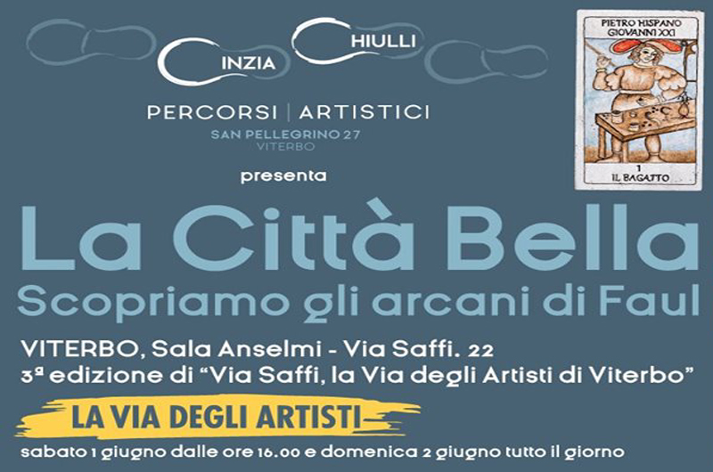 Presso la Sala Anselmi a Viterbo in Via Saffi nell’ambito della 3ª edizione di “Via Saffi, la Via degli Artisti di Viterbo” sabato 1 giugno dalle 16 e domenica 2 giugno tutto il giorno l’artista Cinzia Chiulli di Percorsi Artistici presenta la mostra “La Città Bella”.