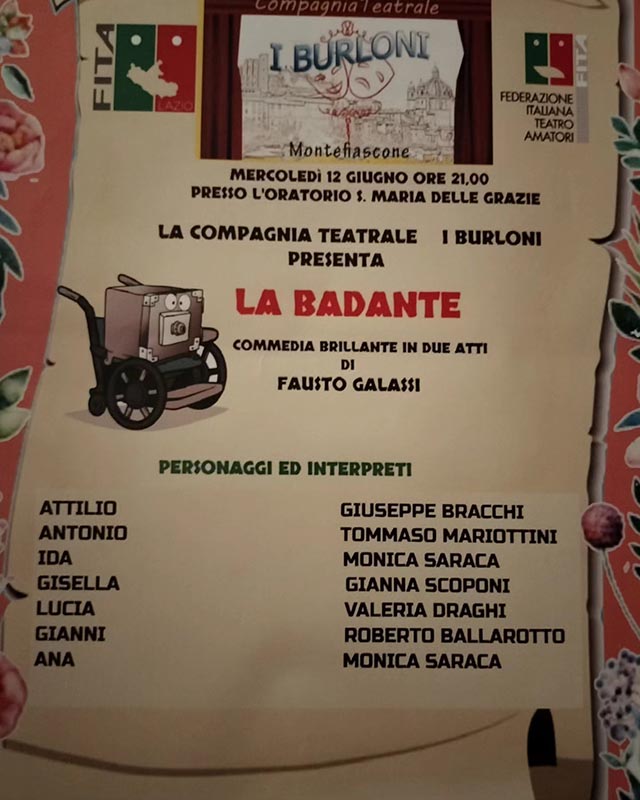Il teatro amatoriale porta in scena una commedia esilarante e quanto mai attuale. La Compagnia Teatrale “I Burloni”, presenta a Montefiascone mercoledì 12 giugno alle ore 21.00 la commedia brillante in due atti La Badante di Fausto Galazzi, presso l’oratorio della chiesa della Madonna delle Grazie. Per chi ci sarà saranno momenti di risate e di tanta allegria. E il cast è composto da personaggi che ci sono familiari, come Monica Saraca la scrittrice cassiera, Giuseppe Bracchi, Valeria Draghi, Roberto Ballarotto, Gianna Scoponi e Tommaso Mariottini.