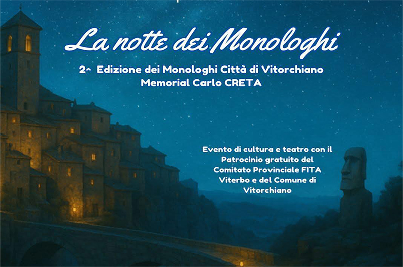 Domenica 14 dicembre  alle ore 18.00 a Vitorchiano presso Auditorium nel complesso Sant’Agnese nel borgo, la Compagnia IN..Stabile presenta la seconda edizione di La Notte dei Monologhi Memorial Carlo Creta. Con il patrocinio gratuito di Fita Viterbo e del Comune di Vitorchiano.L’evento si svolge all’interno del programma del Friendly VillageL’ingresso è gratuito