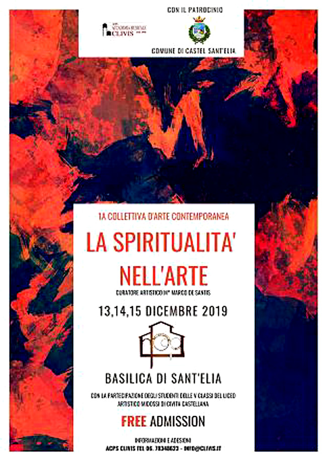 Venerdì 13 Dicembre, alle ore 11:00, presso la Basilica di Sant’Elia inaugurazione della mostra “LA SPIRITUALITA’ NELL’ARTE”, curata da Marco De Santis, realizzata dall’ACPS Accademia Musicale Clivis, con il patrocinio del Comune di Castel Sant’Elia e in collaborazione con il Liceo Artistico Midossi di Civita Castellana.