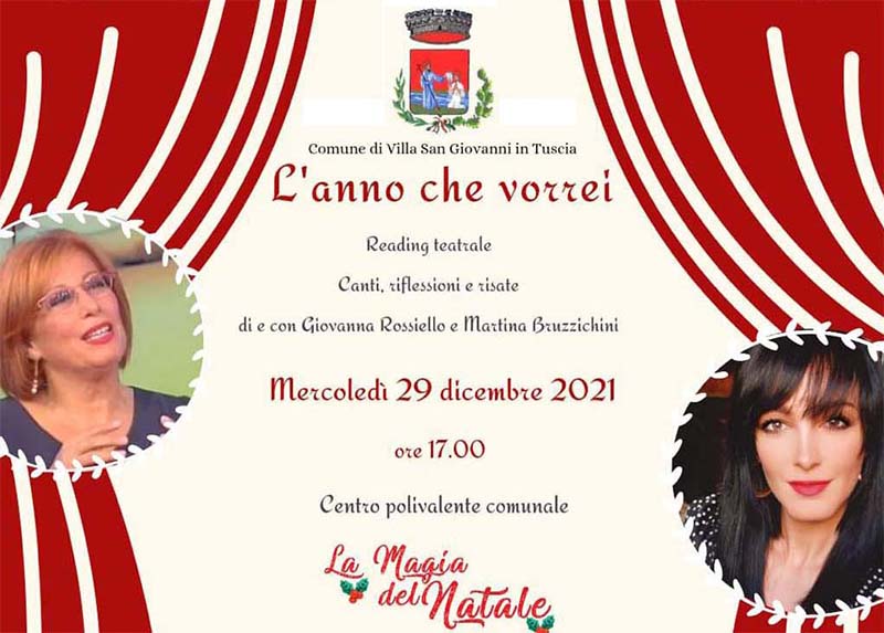 Mercoledi 29 dicembre alle ore 17.00 presso il Centro polivalente comunale di Villa San Giovanni in Tuscia, andrà in scena il Reading teatrale con canti, riflessioni, risate, di e con