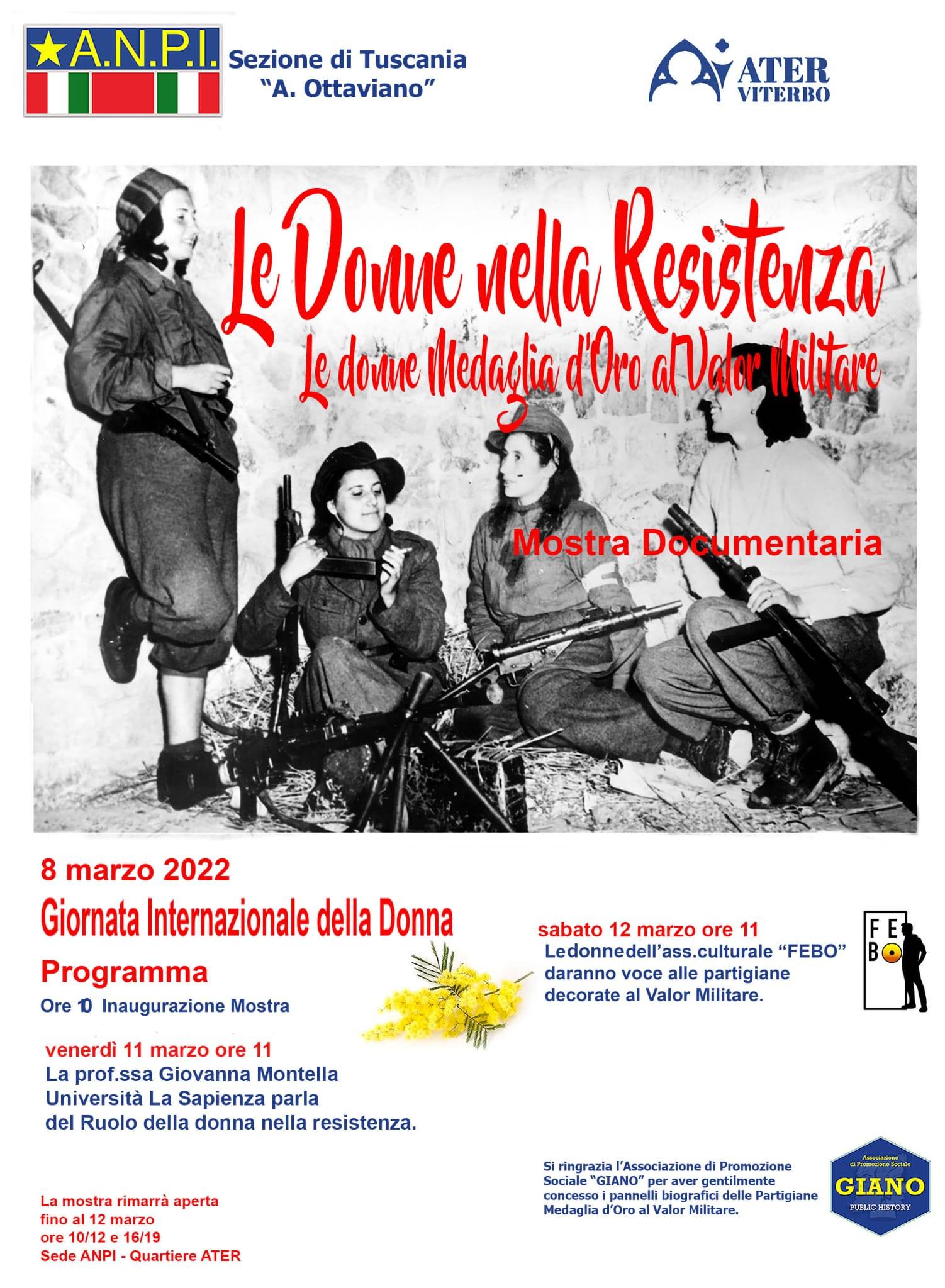 A Tuscania, a cura della sezione ANPI, dall’8 al 12 marzo 2022  la mostra “Le Donne nella Resistenza – Le Donne Medaglia d’oro al Valor Militare”.