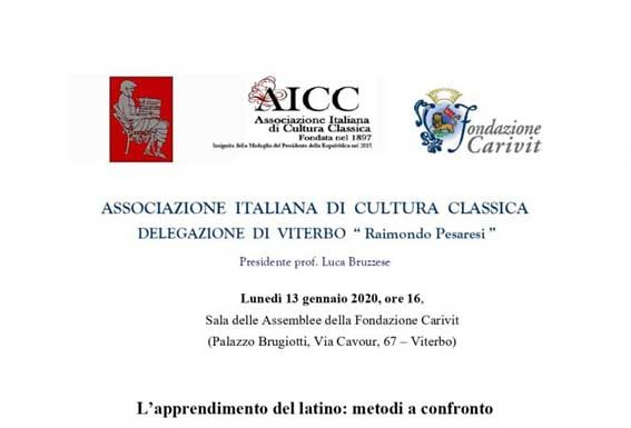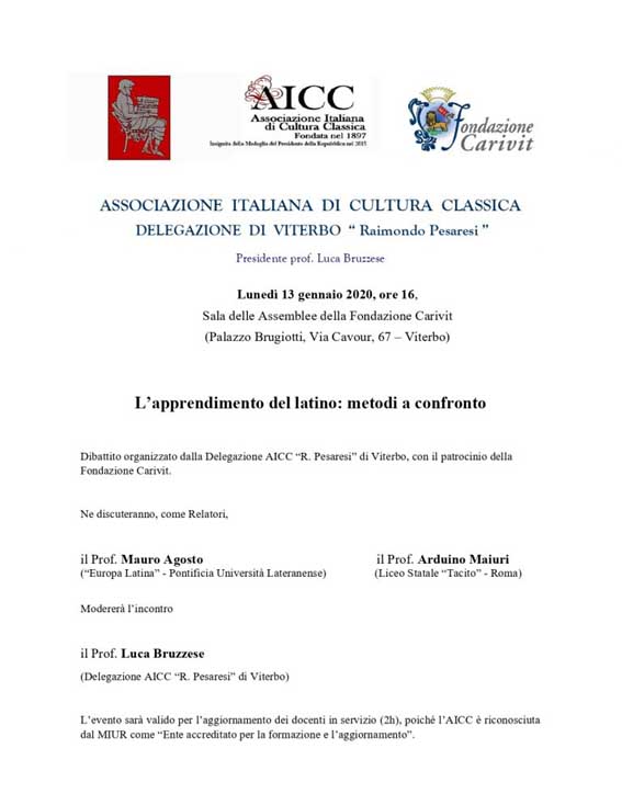 Lunedì 13 gennaio alle ore 16, presso la Sala delle Assemblee della Fondazione Carivit in Via Cavour a Viterbo), si terrà un dibattito dal titolo “L’apprendimento del latino: metodi a confronto”, promosso dalla Delegazione AICC “R. Pesaresi” di Viterbo, con il patrocinio della Fondazione Carivit.