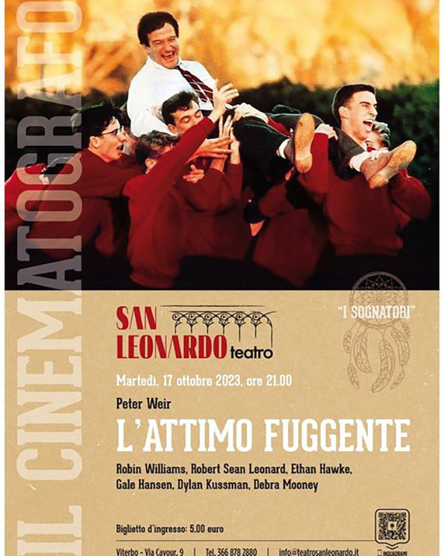 Tutto pronto per la proiezione in sala del film “L’attimo fuggente”, previsto il 17 ottobre alle 21 al Teatro San Leonardo in via Cavour,9, Viterbo.