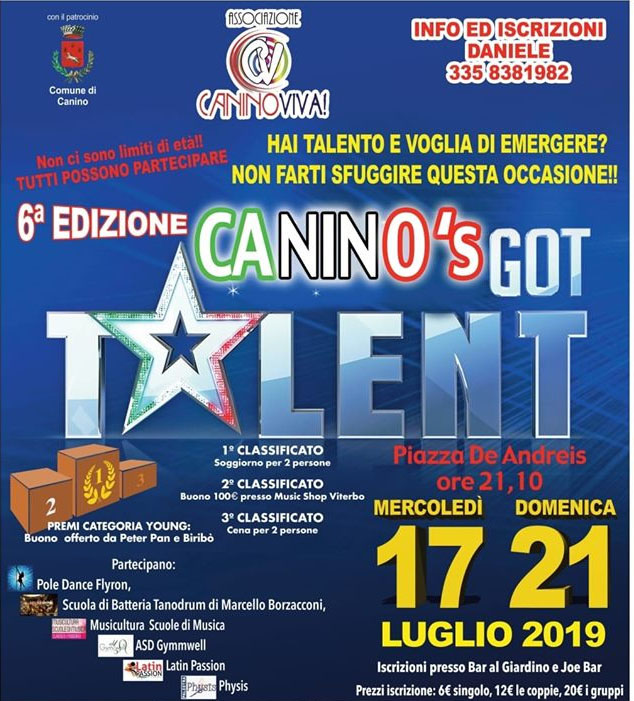 Anche quest’anno l’Associazione CaninoViva guidata da Daniele Ricci, da a tutti appuntamento mercoledi17 luglio e domenica sera 21 luglio, al Talent che contraddistingue l’Estate Caninese, si tratta di “Canino’s Got Talent”, giunto alla sua 6a edizione, che avrà luogo in Piazza De Andreis il 17 e 21 Luglio prossimi dalle ore 21.15. Nella prima sera si svolgeranno le selezioni, mentre nella serata di domenica ci saranno le selezioni e la finale.