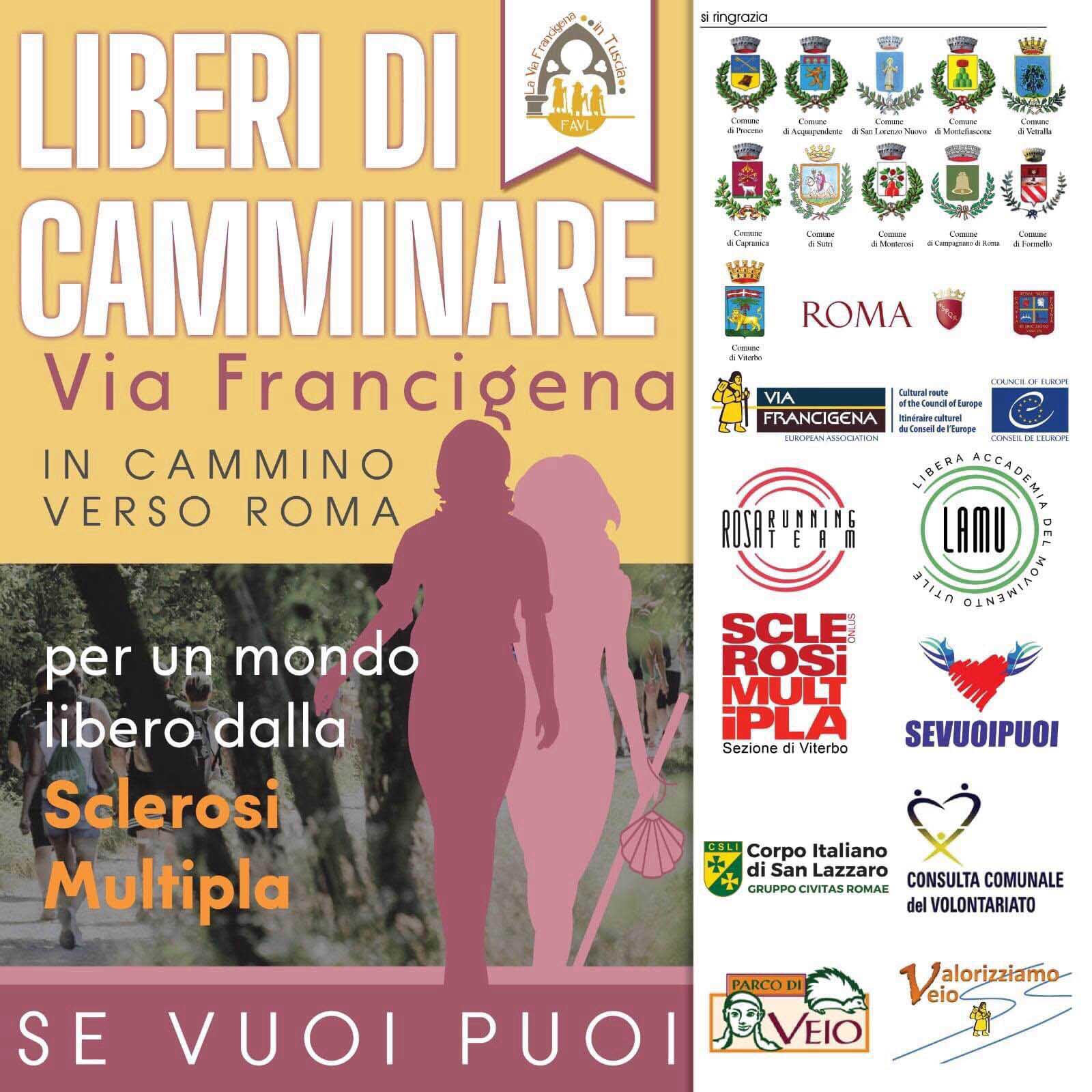 Martedì 1 settembre, alle ore 16.00, a piazza del Plebiscito, il sindaco Giovanni Maria Arena, l’assessore ai servizi sociali Antonella Sberna, il presidente della consulta del volontariato Sergio Insogna e il consigliere delegato ai rapporti con le associazioni e le società sportive Matteo Achilli, a nome della città di Viterbo, saluteranno e accoglieranno Maria Luisa Garatti e Mariella Faustino, due pellegrine speciali, in cammino sulla via Francigena, da Siena a Roma, per promuovere un importante progetto sociale. Liberi di Camminare, un progetto per un mondo libero dalla sclerosi multipla, con l’obiettivo di aiutare chi ne è affetto, promosso nel nostro territorio dall’AISM provinciale e dall’associazione via Francigena in Tuscia Viterbo.