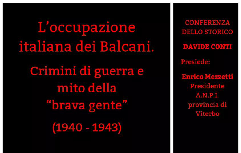 Venerdì 22 novembre, alle ore 16:30, presso la Sala Conferenze della Provincia, via Saffi 49, si terrà la conferenza tenuta dallo storico Davide Conti, sul tema: “L’occupazione italiana dei Balcani. Crimini di guerra e mito della ‘brava gente’ (1940 – 1943)”.