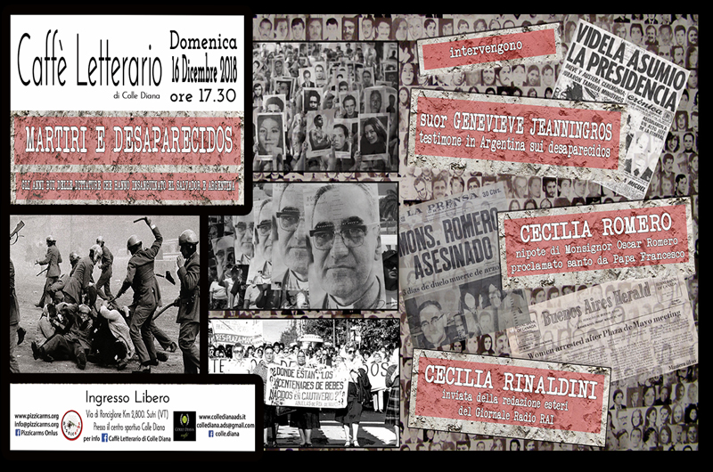 Al Caffè letterario di Colle Diana, a Sutri, domenica 16 dicembre, in un incontro dal titolo “Martiri e Desaparecidos” – Gli anni bui delle dittature che insanguinarono El Salvador e Argentina. Nel corso dell’incontro interverranno Cecilia Romero, nipote di San Oscar Romero, suor Genevieve Jeanningros – testimone diretta del dramma dei desaparecidos, e Cecilia Rinaldini, inviata della redazione esteri del Giornale Radio Rai, esperta di America Latina. La sola e unica giornalista che abbia seguito – e pubblicato online – l’intero processo a militari argentini accusati di crimini contro desaparecidos italiani.