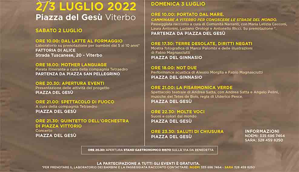 Sabato 2 e domenica 3 luglio a Viterbo, in piazza del Gesù, si festeggia la Giornata Mondiale del Rifugiato. L’evento, organizzato dal Progetto SAI (Sistema Accoglienza Integrazione) del Comune di Viterbo, propone laboratori per bambini, concerti, teatro, fotografia, passeggiate e molto altro ancora, con la partecipazione di Fattorie Solidali, Comunità Narranti, Tetraedro, Orchestra di Piazza Vittorio, Andrea Satta, Fabio Magnasciutti e Marco Palombi. Entrambe le giornate inizieranno alle ore 10.00 per durare fino alle 23.30 circa. Il programma dettagliato è disponibile sulla pagina Facebook “MOLTI VOLTI Accoglienza Migranti Alicenova” (www.facebook.com/siproimicapena).