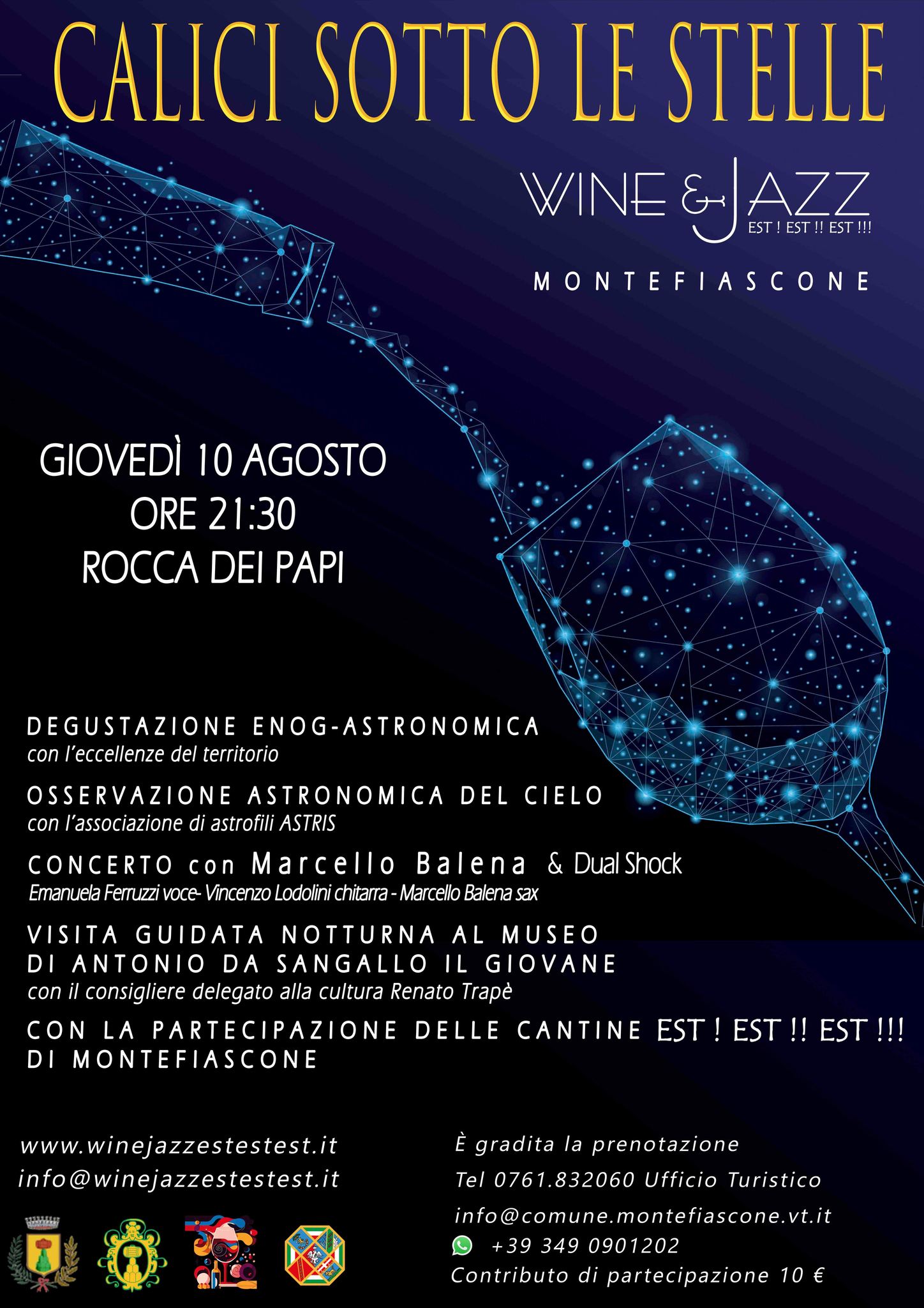 Marcello Balena grande sassofonista con il Duo Shock Emanuela Ferruzzi e Vincenzo Lodolini, che ci faranno immergere in una atmosfera musicale magica, tutto accompagnato dall’attore principale della serata l’Est! Est!! Est!!! delle Cantine di Montefiascone per il brindisi alle stelle più incantevole e romantico dell’anno.