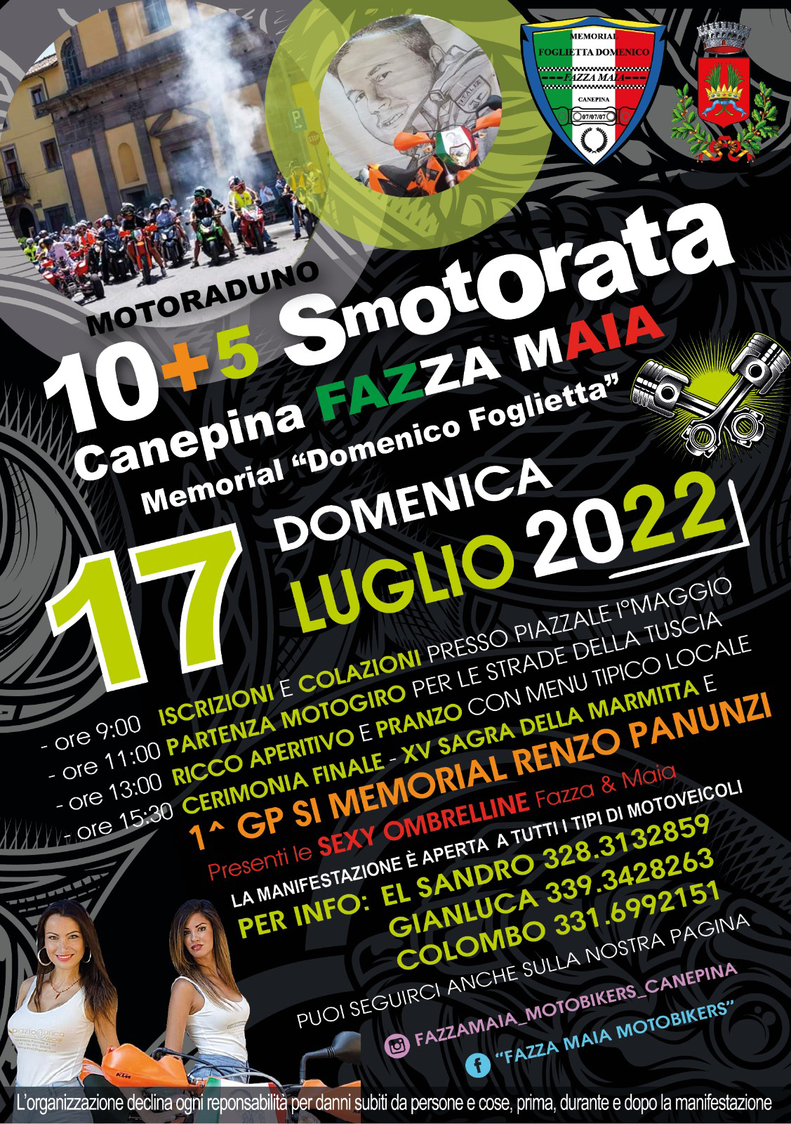 Torna a Canepina domenica 17 luglio, dopo il lungo stop dovuto alla pandemia, la Smotorata – Memorial Domenico Foglietta, motoraduno organizzato dal gruppo Fazza Maia e aperto a tutti i tipi di motoveicoli, giunto all’edizione numero 10+5.