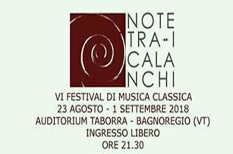 Presso l’Auditorium Taborra a Bagnoregio proseguono gli appuntamenti con il Festival “Note tra i Calanchi”, che iniziato il 23 agosto si chiuderà il 1 settembre con il Gran Galà di fine estate. Una Masterclass di alto perfezionamento e concerti a ingresso libero tutte le sere dalle 21,30 all’auditorium Taborra. Appuntamento dal 23 agosto al primo settembre. Virginia Guidi e Sara Ferrandino della direzione del festival affermano: