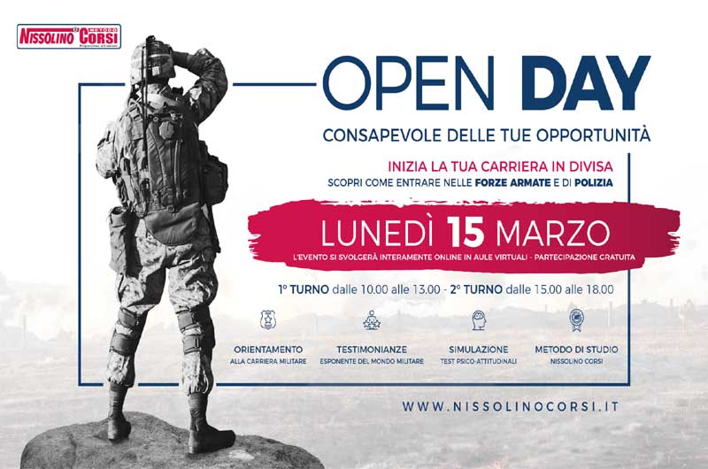La Nissolino Corsi, azienda leader nella preparazione dei Concorsi Militari, lunedì 15 marzo organizzerà l’Open Day – Giornata di Orientamento alle Professioni in Divisa – durante il quale tutti i giovani interessati alla carriera in divisa potranno ottenere tutte le informazioni sui bandi di concorso e sulle opportunità di studio e di carriera fornite dalle Forze Armate e dalle Forze di Polizia. Quest’anno l’evento si svolgerà interamente online in aule virtuali per questioni di sicurezza legate al COVID -19. I partecipanti saranno collegati in Live Streaming e moderati in Chat. La giornata sarà divisa in due turni gemelli, uno dalle 10,00 alle 13,00 e l’altro dalle 15,00 alle 18,00.