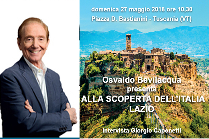Domenica 27 maggio alle ore 10.30 a Tuscania  il conduttore Osvaldo Bevilacqua presenta il suo volume: “Alla scoperta dell’Italia-Lazio” in viaggio con Sereno Variabile.Intervisterà l’autore Giorgio Caponetti .Appuntamento in Piazza D.Bastianini a Tuscania.