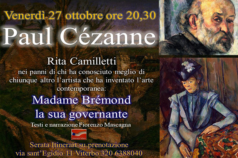 Riprendono le serate culturali allo spazio Itinerart in via sant’Egidio, 11 (traversa di corso Italia), ideate dall’artista, scultore, critico d’arte Fiorenzo Mascagna. Venerdì 27 ottobre alle ore 20.30 l’appuntamento è con Paul Cèzanne, questa è la volta della governante di casa Cézanne che svelerà curiosità e segreti. Paul Cézanne è stato un pittore francese, appartenente alla corrente post-impressionista, il suo lavoro gettò le basi del passaggio dalla concezione ottocentesca dell’attività artistica ad una nuova e radicalmente diversa del XX secolo. La narrazione sarà da parte dello stesso Mascagna.