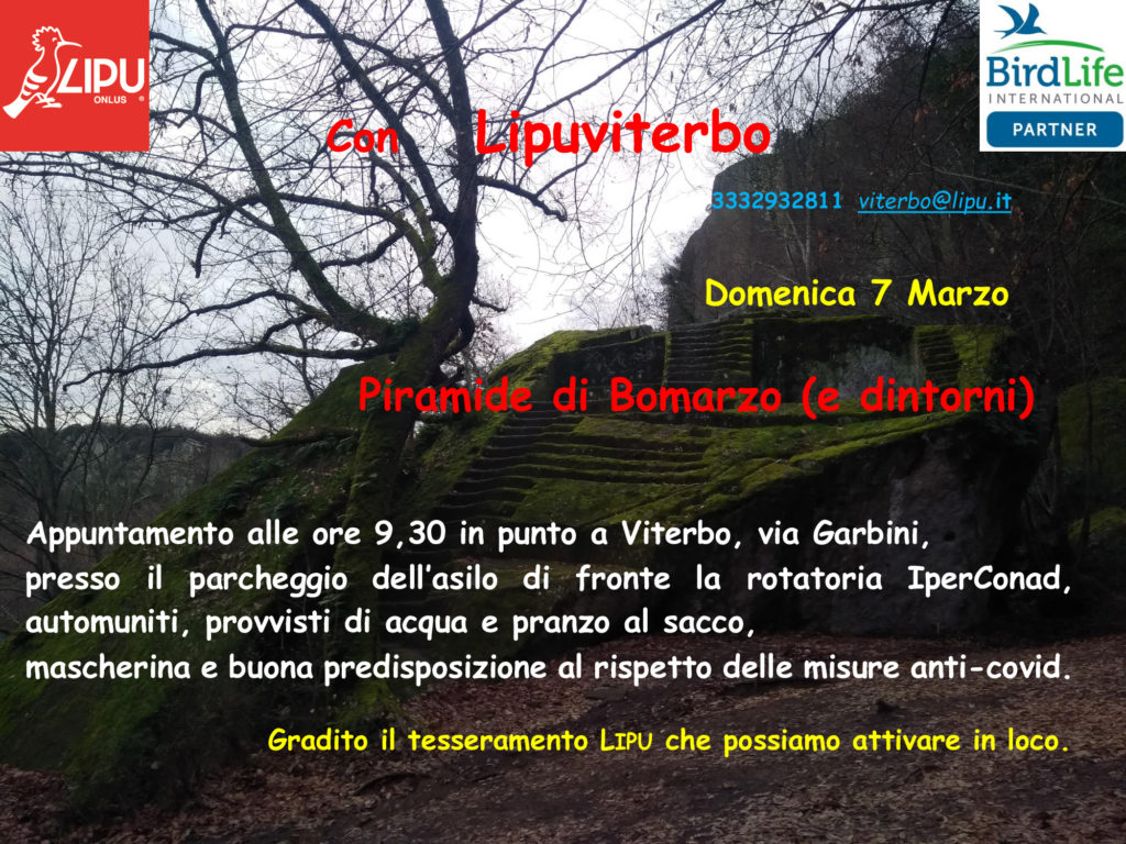 Uscita escursionistica della Lipu di Viterbo alla Piramide di Bomarzo lì da migliaia d’anni e probabilmente è più antica della civiltà Etrusca. Appuntamento Domenica 7 marzo alle ore 9.30 presso il parcheggio dell’asilo di fronte la rotatoria IperConad, automuniti, provvisti di acqua e pranzo al sacco, mascherina e buona predisposizione al rispetto delle misure anti-Covid.