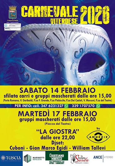 Giovedì 5 febbraio alle ore 14.30, nella sala consiliare di Palazzo dei Priori, verrà presentata alla stampa la prossima edizione del Carnevale Viterbese.
